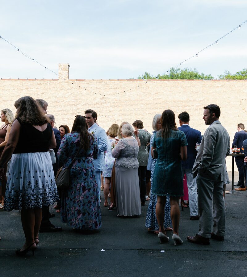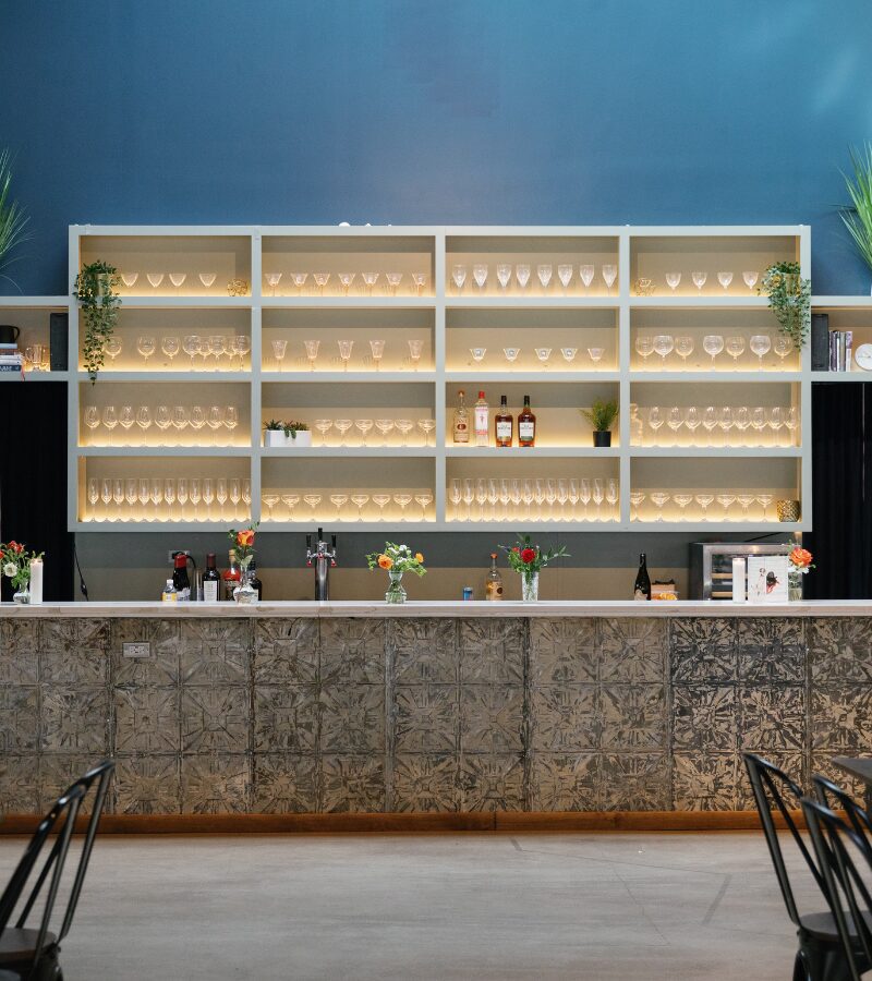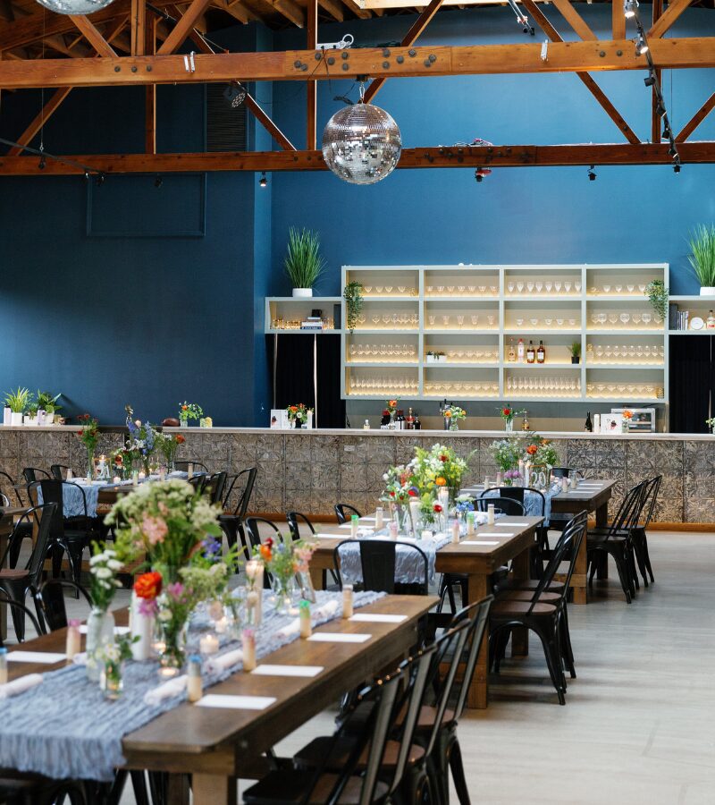 Defined by soaring 21-foot ceilings, a double bow truss structure, and abundant natural light from skylights and glass garage doors leading to the East Courtyard, the venue blends architectural character with a warm, welcoming feel. Exposed Chicago brick, polished concrete floors, and a 35-foot backlit quartz bar anchor the space, while two open yet distinct areas allow for a flexible event layout.